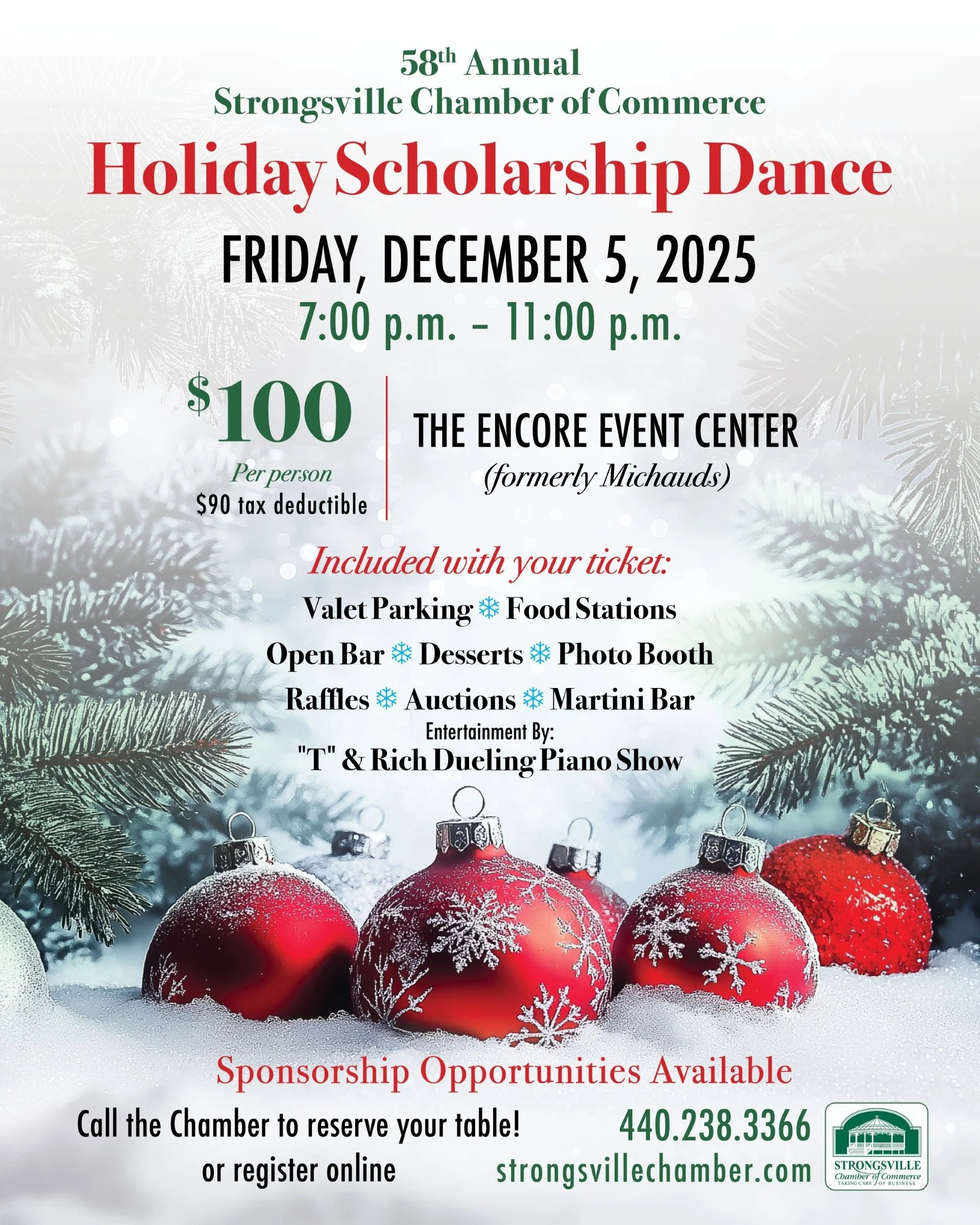 The Strongsville Chamber of Commerce scholarships are funded by proceeds from the annual Holiday Scholarship Dance held each December. The Chamber is proud to have donated more scholarships, with a higher dollar value, than any other local organization in Strongsville.